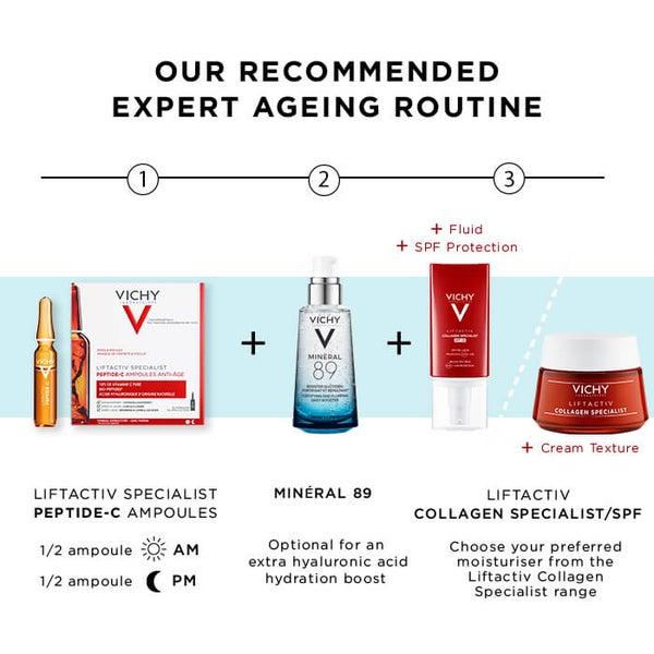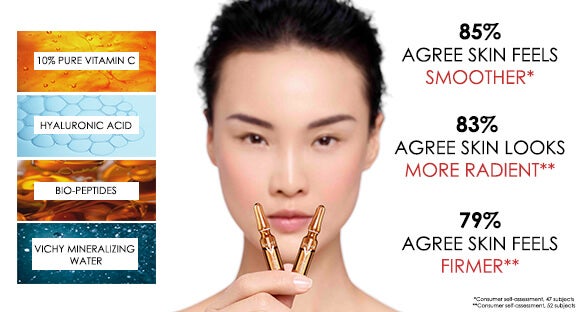 Supercharge your skin. A concentrated daily anti-wrinkle dose. Introducing Vichy’s first, protective ampoule to target fine lines and wrinkles, lack of firmness and boost skin radiance, concentrated in key dermatological actives. The glass, amber ampoule preserves freshness and clinically proven efficacy, preventing oxidation and contamination.
